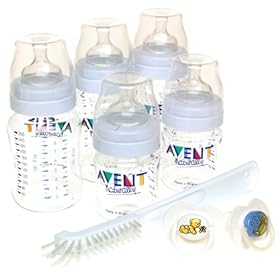 The Newborn Starter Set is the ideal gift for new moms and their babies. It includes everything that you need for that special day when you bring baby home. The key feature of the Philips Avent newborn starter set bottles is the patented anti-colic nipple. It has an anti-vacuum skirt and one-way air valve that reduces air into the baby's stomach, and hence, reduces painful gas and colic. The natural shape and feel of the silicone nipple closely resembles the breast to make it easier to combine bottle and breastfeeding. The wide-neck bottles are easy to refill and clean. The cap seals the nipple to prevent leaking while mixing or traveling. The set includes two 4-oz. and three 9-oz. reusable bottles and five Avent anti-colic nipples, five dome caps, two newborn pacifiers with caps, and a bottle brush.